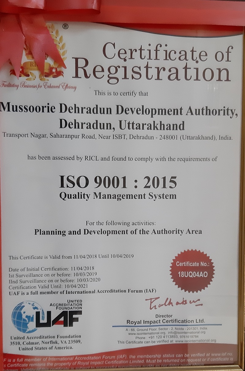 An ISO 9001:2015 Certified Authority ckitadminAwards & Recognitions MDDA received ISO 9001:2015 certificate for Quality Management System from M/s Royal Impact Certification Ltd on 11.04.2018 for Planning and Development of Authority Area .This certificate is valid till 10.04.2019.