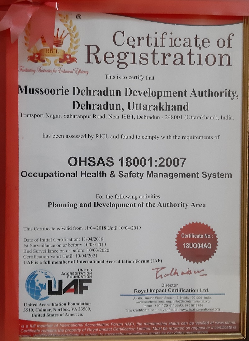 MDDA received OHSAS 18001:2007 certificate for Occupational Health and Safety Management System from M/s Royal Impact Certification Ltd on 11.04.2018 for Planning and Development of Authority Area .This certificate is valid till 10.04.2019.
